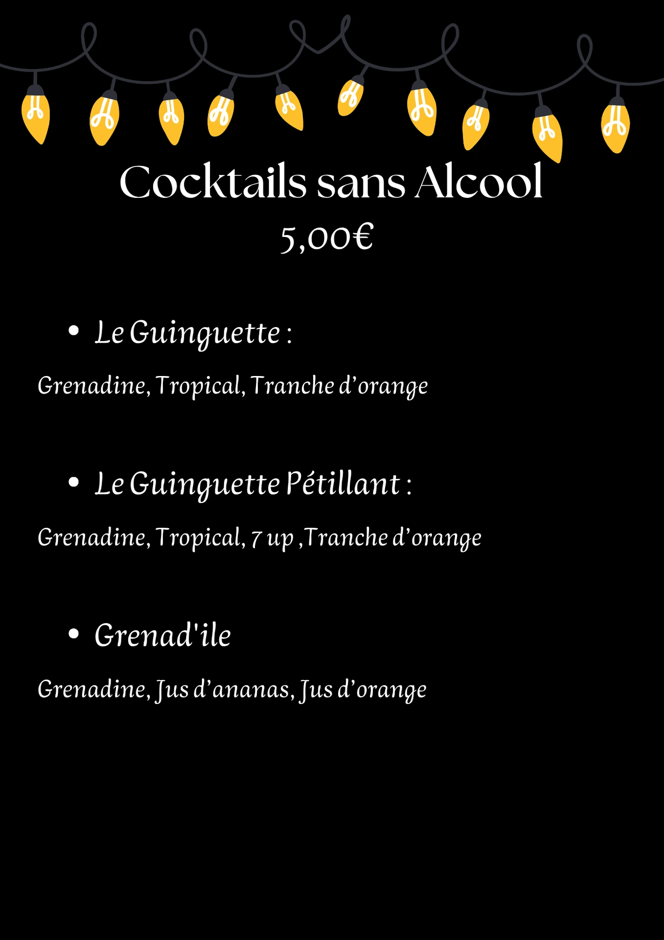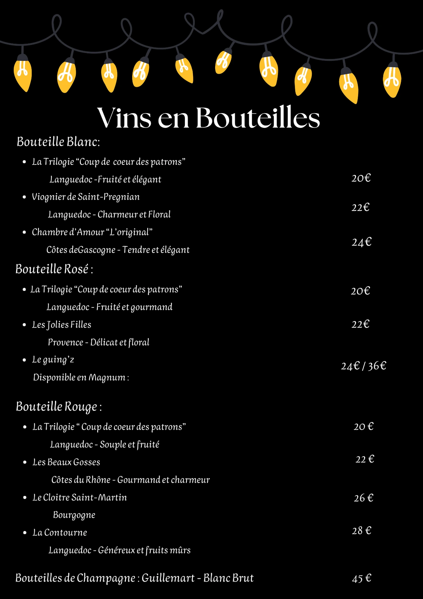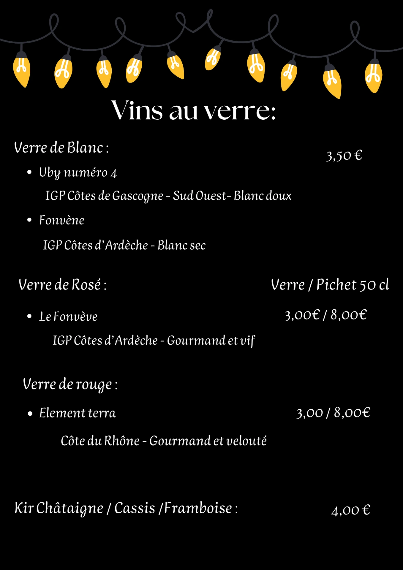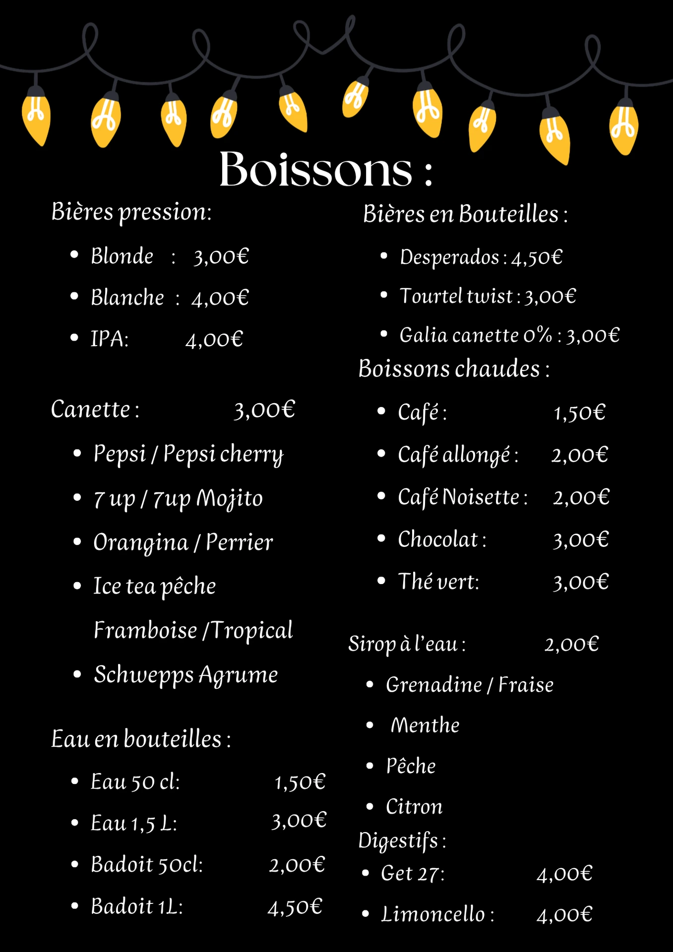 Nous vous proposons un large choix de boissons. Sodas, jus, cocktails, bières et une sélection de bons vins : une carte variée qui s’adapte à toutes les envies et à tous les moments de la journée..